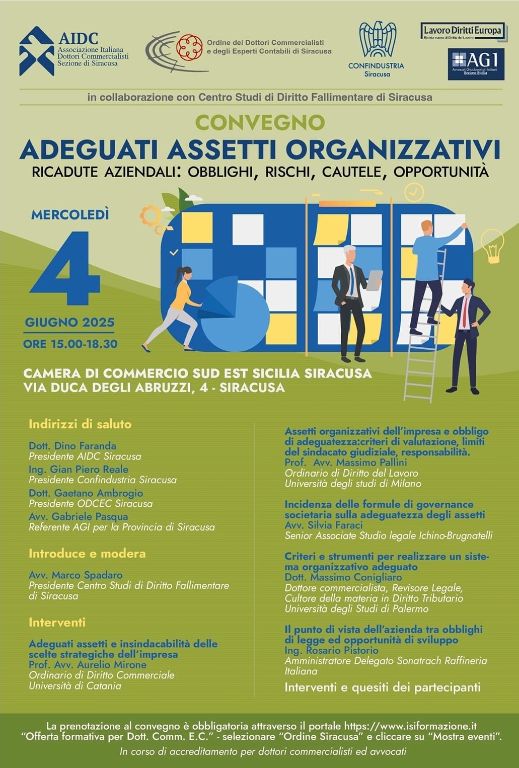 Siracusa, 4 giugno 2025 – Si è tenuto presso la Camera di Commercio del Sud Est Sicilia il convegno “Adeguati Assetti Organizzativi: ricadute aziendali tra obblighi, rischi, cautele e opportunità”, promosso da AIDC Siracusa, ODCEC Siracusa, Confindustria Siracusa e AGI, in collaborazione con il Centro Studi di Diritto Fallimentare di Siracusa.
