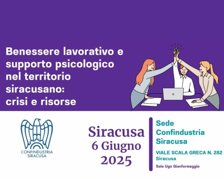 Ambiente, salute e sicurezza Convegni Formazione e capitale umano Lavoro e relazioni sindacali Sindacale SostenibilitĂ e transizione Convegno: “Benessere lavorativo e supporto psicologico nel territorio siracusano: crisi e risorse” – Venerdì 6 giugno 2025 – Ore 14:30